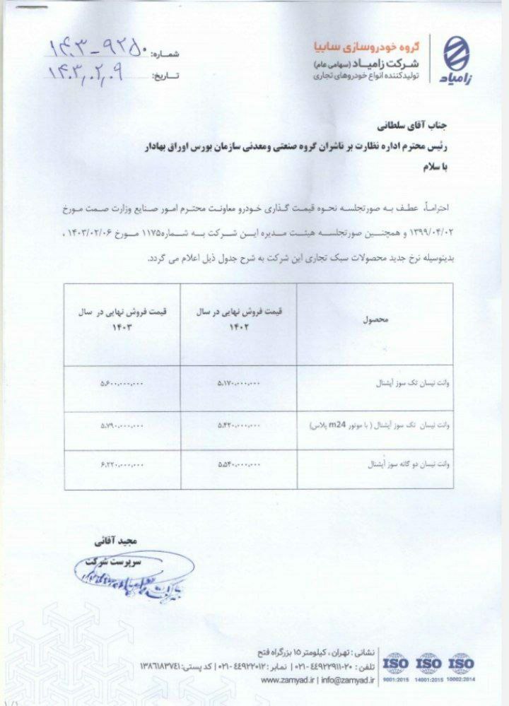 اعلام قیمت جدید محصولات زامیاد همراه با افزایش نرخ – دی ۱۴۰۳